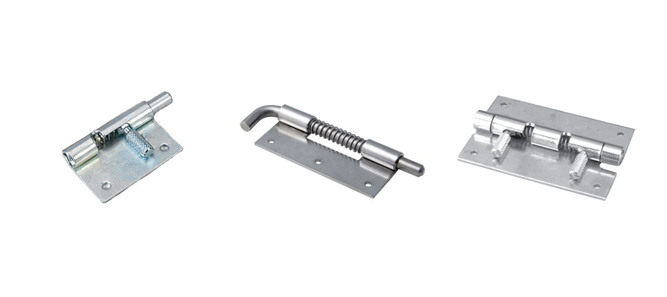 - Modelos com pino retrátil com mola mantém os pinos completamente retraídos, facilitando a instalação e remoção de portas, ou completamente engatados, garantindo uma operação segura