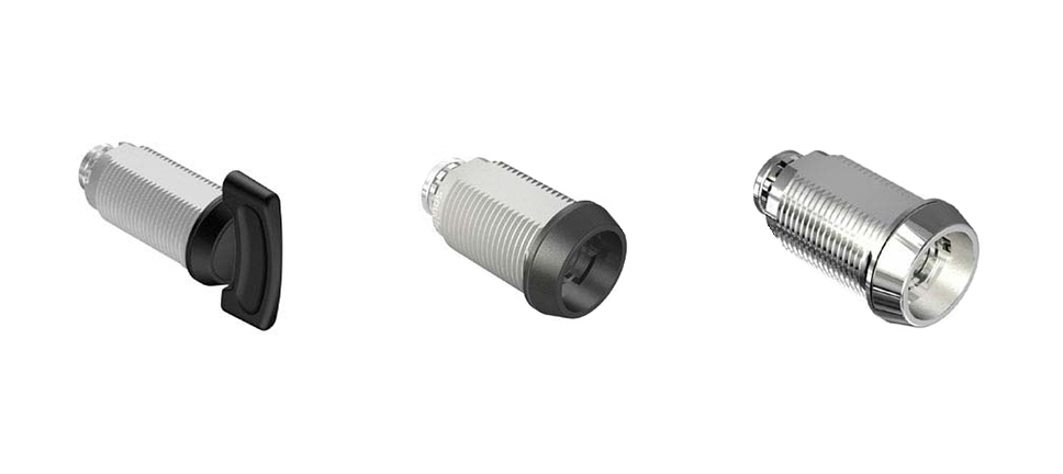 - Os tamanhos miniatura atendem a requisitos de altura desde 21,5 mm (0,85") de altura, com uma exposição frontal de um flange de somente 14,9 mm (0,59") de diâmetro e um mínimo de 16,4 mm (0,65") de saliência da lingueta desde o eixo central